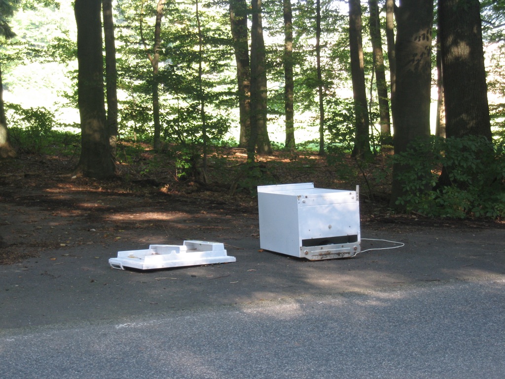 Der Kühlschrank lag letzte Woche schon in dem Waldweg. Mhh, ich dachte, daß diese Woche eine kalte Cola drin ist. Aber was sehe ich. Der Kühlschrank ist umgekippt, die Tür ist rausgerissen und er hat keinen Strom. Was es doch für Leute gibt. Unglaublich… :-?