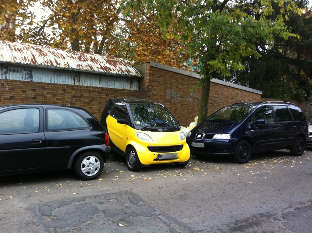 Der gelbe Smart ist ja schon bekannt aus „Smart Parken„. Wahrscheinlich parkt er immer so. Es gibt ja sonst auch keinen Grund so ein Spielzeugauto zu fahren. :-)