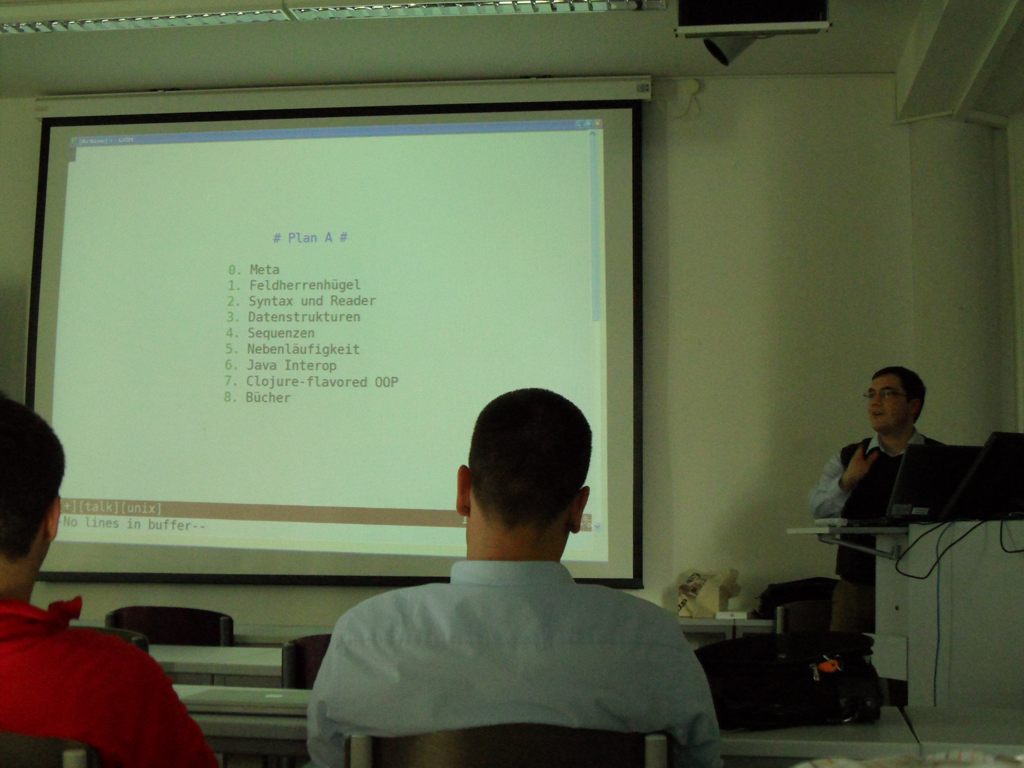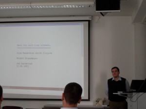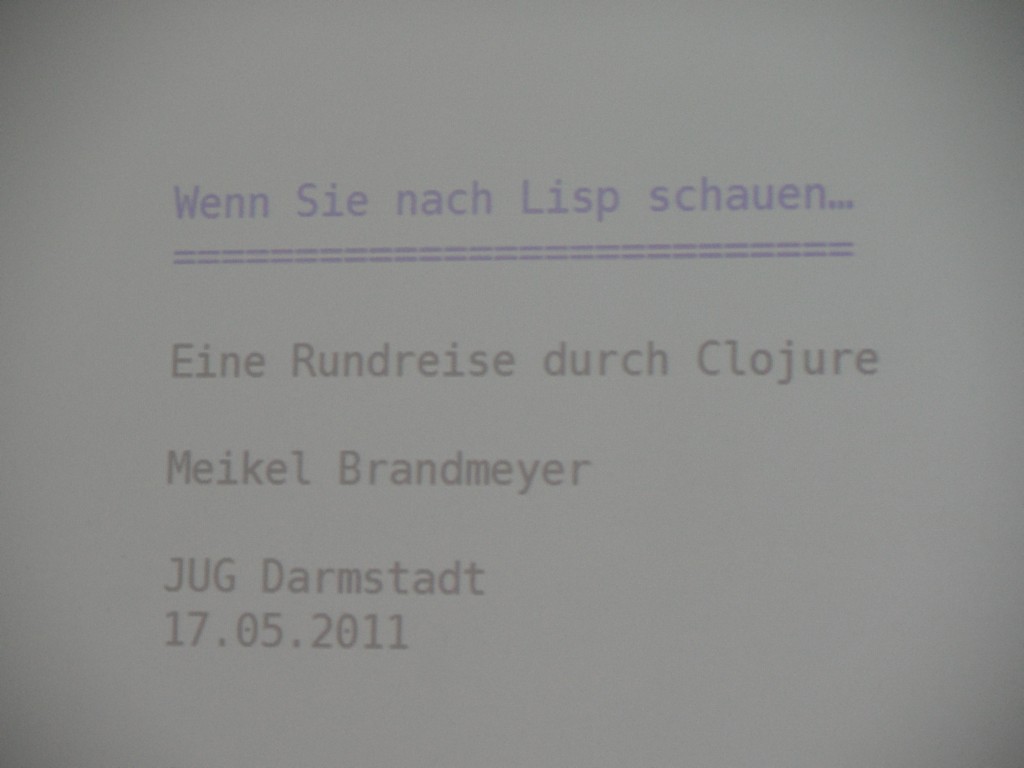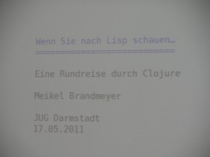 Am Dienstag war Meikel Brandmeyer bei der JUG-DA (Java-User-Group Darmstadt) und hat einen Vortrag zum Thema Clojure gehalten. Nachdem schon Vorträge zum Thema Groovy und Scala gehalten wurden, war diesmal also Clojure an der Reihe.