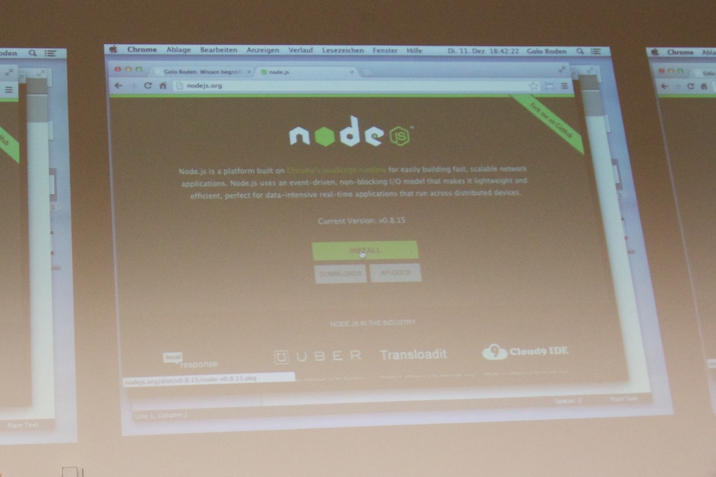 Bei dem Live-Coding wurde zuerst das typische „Hello World!“-Beispiel vorgestellt. Anschließend hat Golo gezeigt, wie man mit Node.js einen Webserver mit 5 Zeilen Code erstellt. Bis dahin hatte ich das alles schon bei Vorträgen von Ryan Dahl – A guided introduction to Node und Stefan Tilkov – Node.js – Asynchronous IO for Fund and Profit gesehen. Dann ging es aber mit einem Chat-Server auf Basis von Express.js und Now.js weiter. D.h. er ist auf Module und das „Ökosystem“ rund um Node.js eingegangen und hat demonstriert wie „einfach“ es ist, Module einzubinden. Diesen Teil des Vortrags fand ich sehr interessent, weil er verdeutlicht hat, was mit Node.js möglich ist.