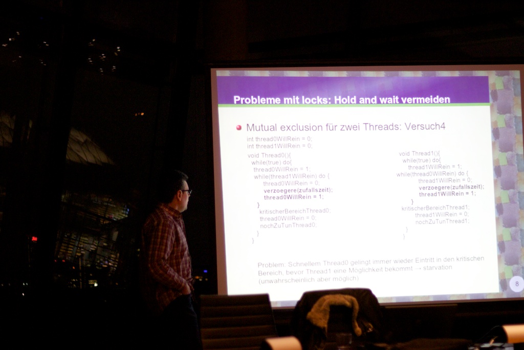 Zu Beginn des Vortrags ist er erstmal generell auf Threads und Parallelisierung und allgemeine Problem und Lösungsansätze eingegangen. D.h. Prozesssynchronisation, Parallelisierung und den Dekker-Algorithmus. Weiter ging es mit einer Einführung in Aktoren/Actors . Anschließend hat Martin verschiedene Beispiele für Aktoren vorgestellt. Beispielsweise Actors in Scala, Lift und dem Akka-Framework, wobei das Hauptaugenmerk auf Scala lag.