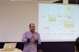 Anschließend hat er eine von ihm programmierte GWT-Anwendung vorgestellt und erklärt auf was bei der Entwicklung zu achten ist. Dabei ist er auf Themen, wie Architektur, Performance und Usabilty eingegangen.