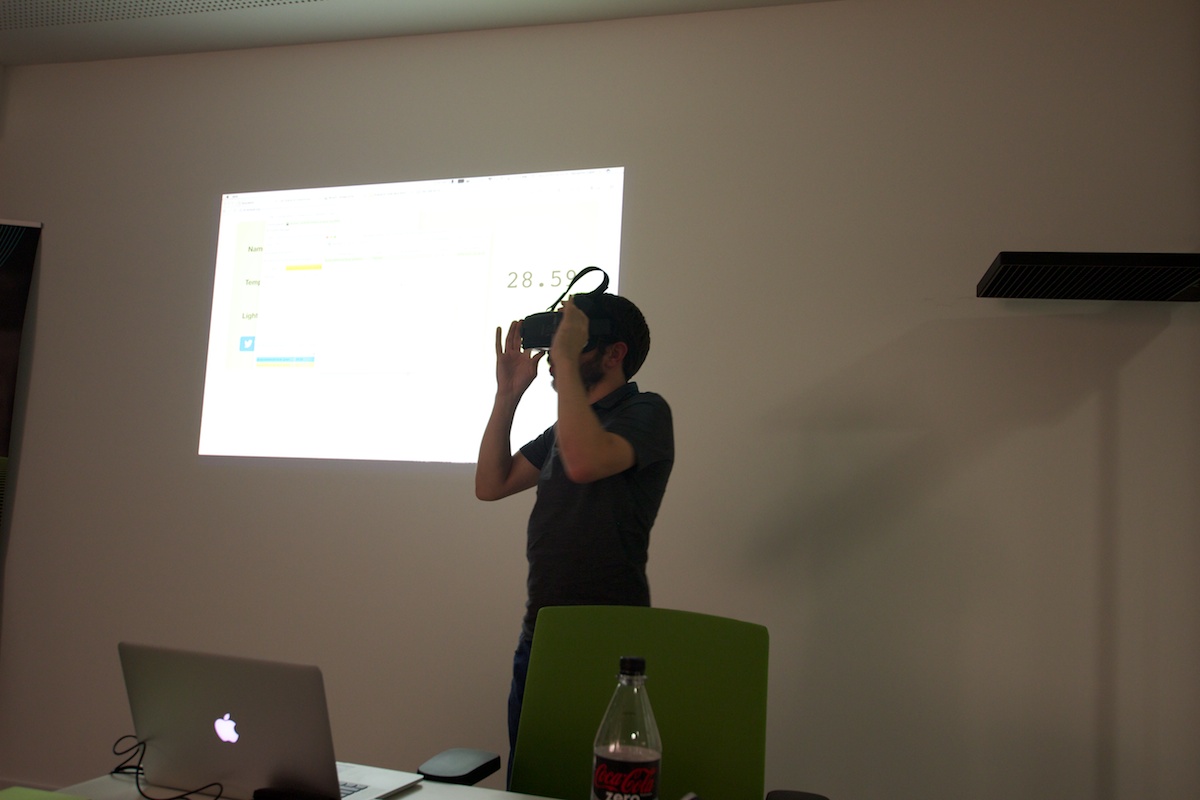 He also had a small demo with a temperature sensor and a diode connected to a RaspberryPi. When a defined temperature was exceeded the diode went on. For the presentation, Benjamin had created a surface, which ran in browser and also transferred it to a GearVR (Smartphone)).