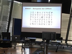 Nachdem Heiko das Prinzip von ML und die Umsetzung mit Spark erklärt hatte, ging es mit einem Beispiel weiter. Es gibt einen umfangreichen Testdatensatz, in dem handschriftlich Zahlen und der passende Wert enthalten sind. (MNIST database). Der Datensatz enthält 50.000 Trainingsdaten mit Klassifizierung und 10.000 Testdaten mit Klassifizierung.