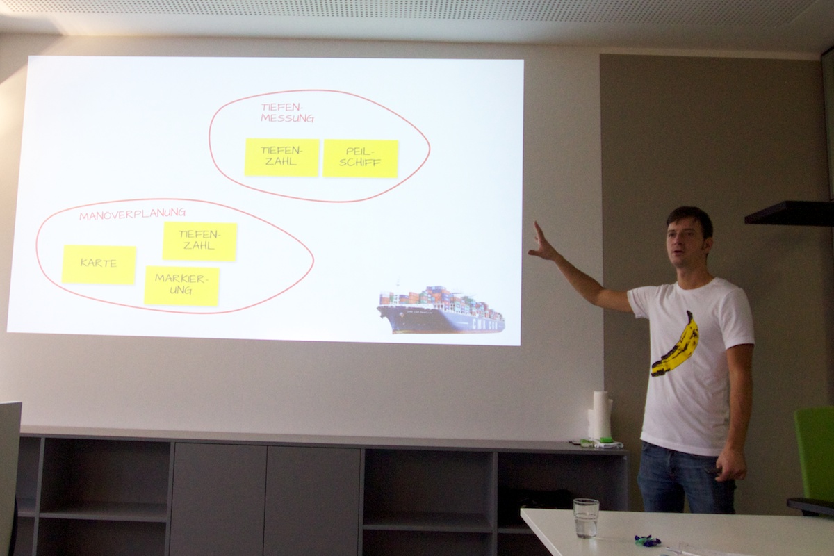 Nachdem er uns die Ubiquitous Language der Domäne durch eine Geschichte (Storytelling?) näher gebracht hatte, ging es mit einer Problemstellung weiter. Die Aufgabe, die WPS hatte, war eine Software zu entwickeln, die es ermöglicht, die Containerschiffe „einfach“ in den Hafen zu navigieren.