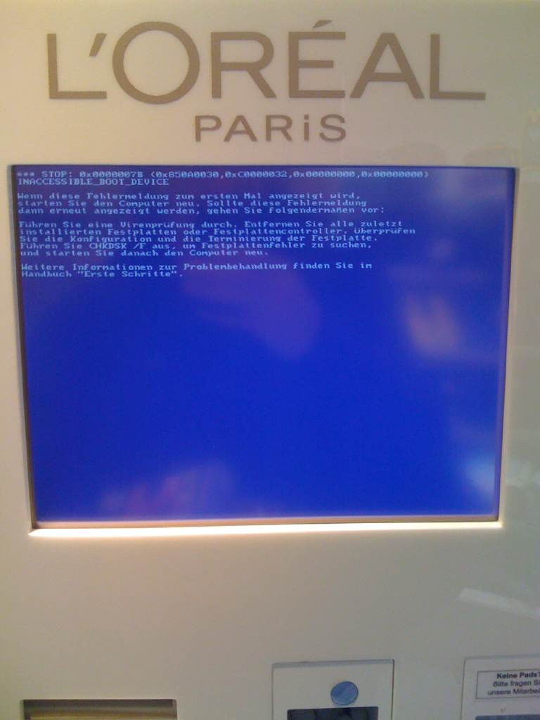 Windoofs ist fehlerfrei… Veröffentlicht am 30. September 2009 von hameister Ich bin mir sicher, daß das ein Benutzerfehler war. Es liegt ganz sicher nicht am Betriebssystem… :-) (Das ist übrigens ein Verkaufsaufsteller, der bei der DM-Drogerie steht.)
