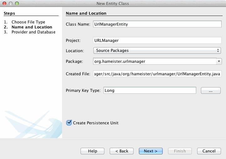 Der erste Wizard-Schritt Choose File Type wird automatisch übersprungen. In zweiten Schritt Name and Location wählen wir als Class name den Wert UrlManagerEntity und tragen als Package den Wert org.hameister.urlmanager ein. Wichtig ist, dass die Checkbox Create Persistence Unit aktiviert ist. Weiter geht es mit Next.