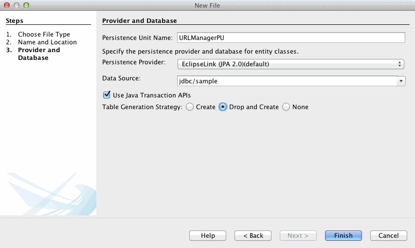 Im Schritt Provider and Database kann unter Persistence Unit Name der Wert URLManagerPU unverändert belassen werden. Als Persistence Provider wird EclipseLink verwendet. Für die Data Source verwenden wir jdbc/sample und setzen als Table Generation Strategy den Radiobutton Drop and Create. ACHTUNG: Bei jedem Start wird dadurch die Datenbank zurückgesetzt. Also nichts für den produktiven Betrieb. :-)