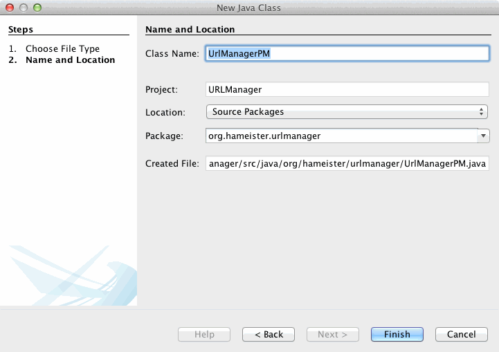 Im Wizard-Schritt Name and Location wird unter Class name der Wert UrlManagerPM eingetragen. Als Package wird org.hameister.urlmanager verwendet und mit Finish der Dialog geschlossen.