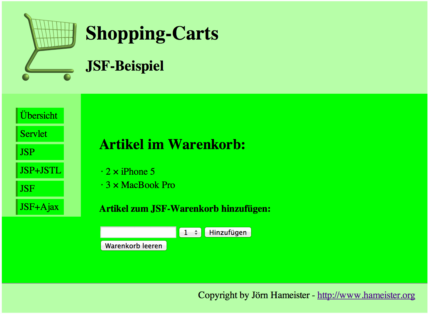 In den folgenden fünf Artikeln werden Servlets, JSP-Seiten und JSF-Seiten vorgestellt, wobei noch auf die JSTL und Ajax eingegangen wird. Mit jeder dieser Technologien wird das "bekannte" Einkaufswagen-Beispiel umgesetzt. D.h. es gibt eine Liste mit Artikeln, die in einen Einkaufswagen (Shopping-Cart) gelegt und auch wieder entfernt werden können.