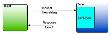 Auf der Abbildung sieht man, wie der Client einen Request an den Service /itemService/itemstring des Servers absetzt. Die Response mit dem Ergebnis Item 1 wird vom Server zurück an den Client geliefert, sobald sie vorliegt.