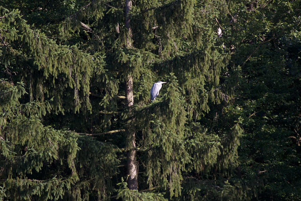 Der Fischreiher saß gegenüber im Wald und hatte sich gerade den Bauch voll geschlagen.