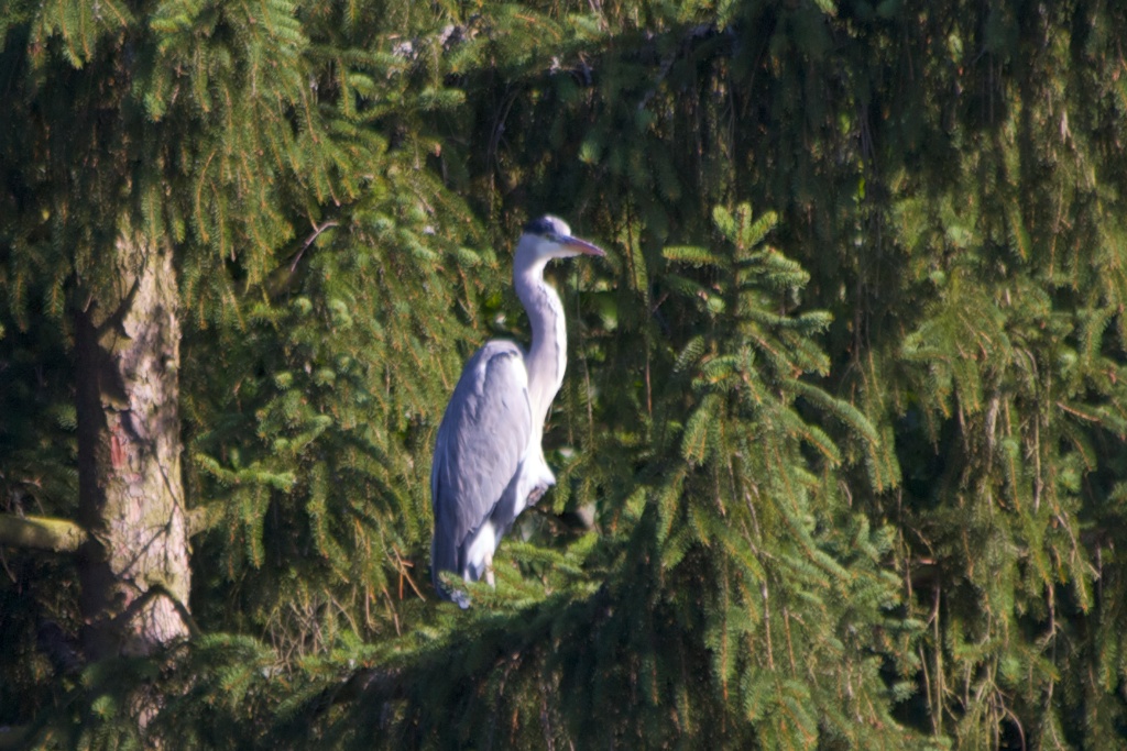 Der Fischreiher saß gegenüber im Wald und hatte sich gerade den Bauch voll geschlagen.