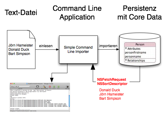 Ausgehend von dem Tutorial Simple Core Data Command Line Importer werden nun alle Core Data Datensätze ausgelesen und dann sortiert ausgegeben. Verwendet wird dafür der NSSortDescriptor