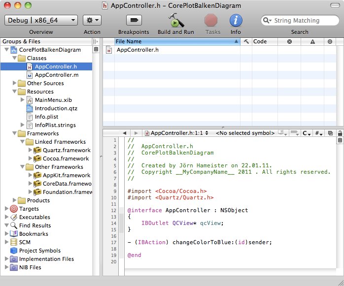 Als Name wird bei dem Beispiel CorePlotBalkenDiagramm gewählt. Das neue Projekt sollte dann ungefähr so aussehen: