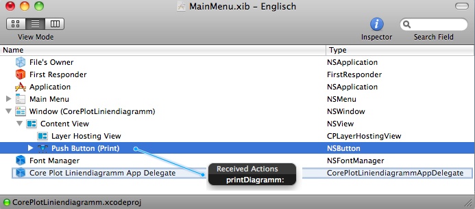 verbunden. Dazu wird im InterfaceBuilder das MainMenu.xib ausgewählt, der Push Button (Print) selektiert und mittels crtl-drag auf den AppDelegate gezogen. Dort wird printDiagramm ausgewählt.